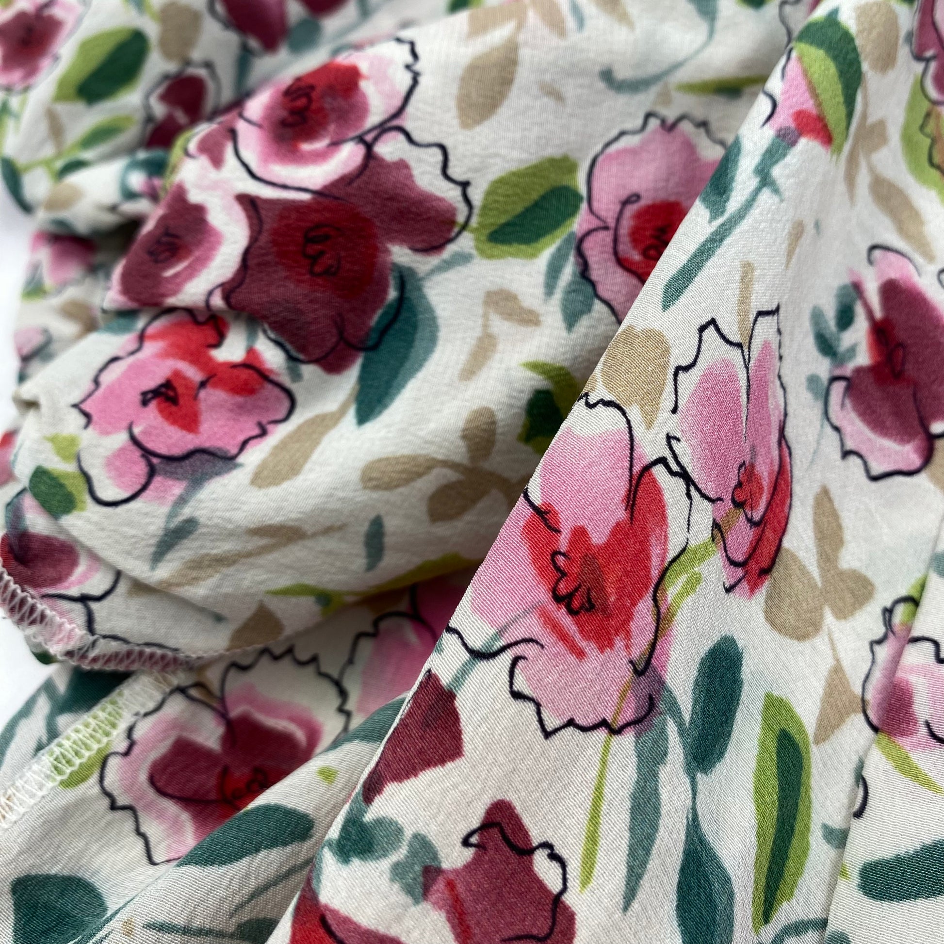 Elegante blouse van Dolce & Gabbana. Crèmekleurige basis met delicate roze bloemendetails, gemaakt van 100% zijde. Licht en luchtig met een vrouwelijk strikdetail in de hals.