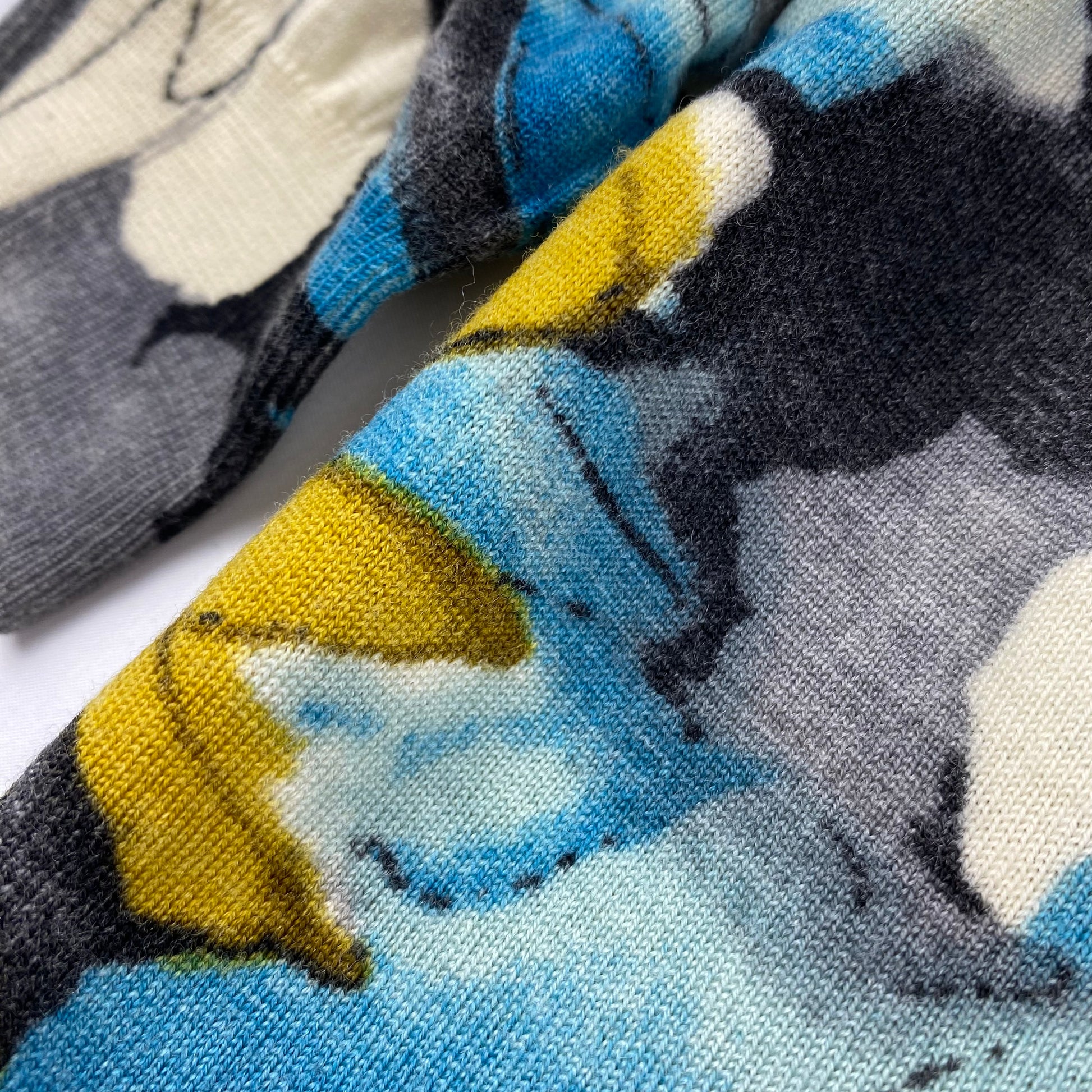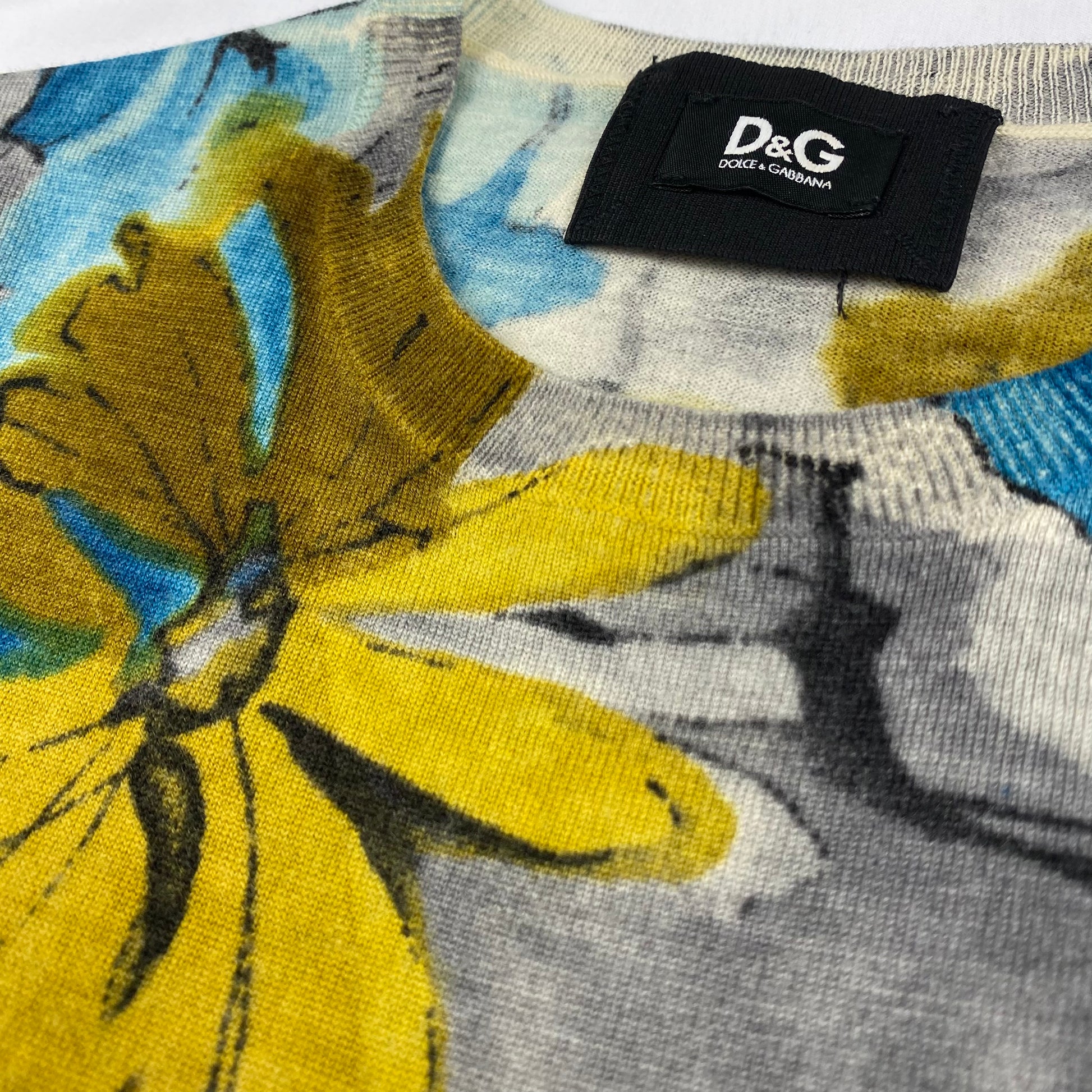Elegante jurk van Dolce & Gabbana. Voorzien van een blauw, geel en wit bloemenmotief op een lichte wollen stof. Ontworpen met korte mouwen voor een fris, luchtig gevoel.