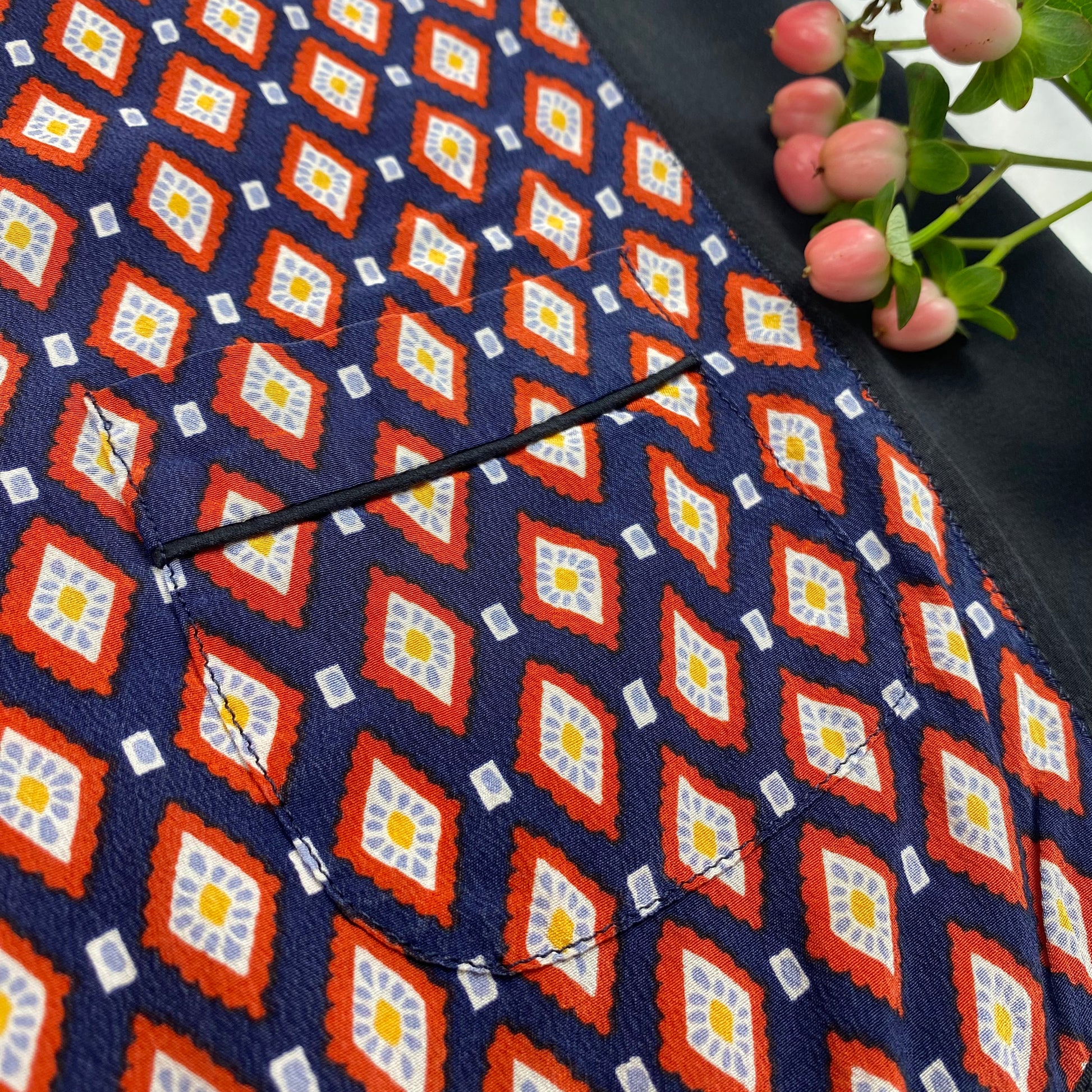 Zijden top van Marc Jacobs. Wit-rood-geel-blauw bloemenpatroon op een donkerblauwe achtergrond aan de voor- en achterkant (sluit daar met knopen), de zijkanten van de top zijn effen zwart. Het heeft één zak aan de voorkant. Dun en comfortabel materiaal.