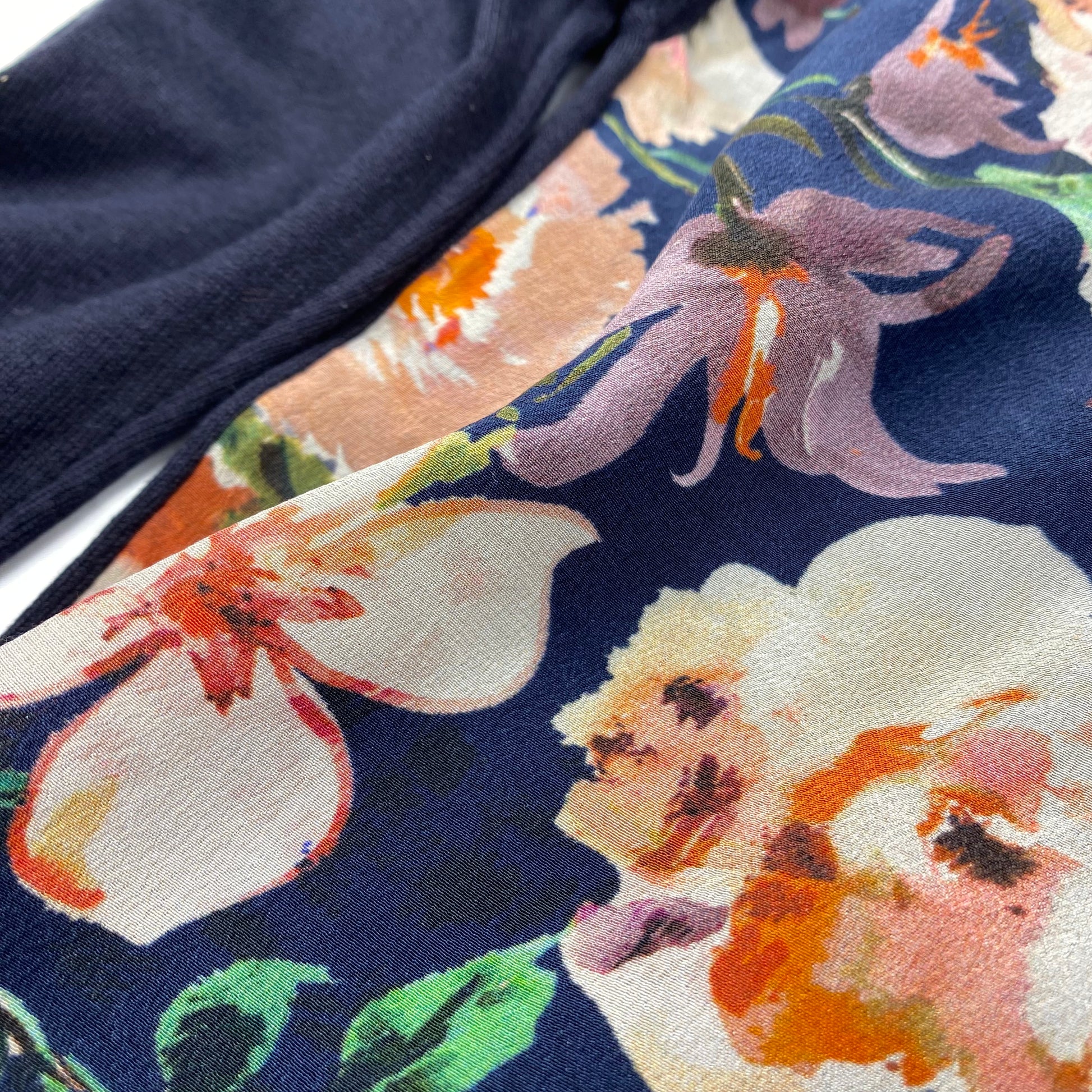 Top van Max Mara. Voorzijde met bloemenprint van gladde stof, terwijl de effen zwarte mouwen en achterkant zijn gemaakt van een breiselachtig materiaal.