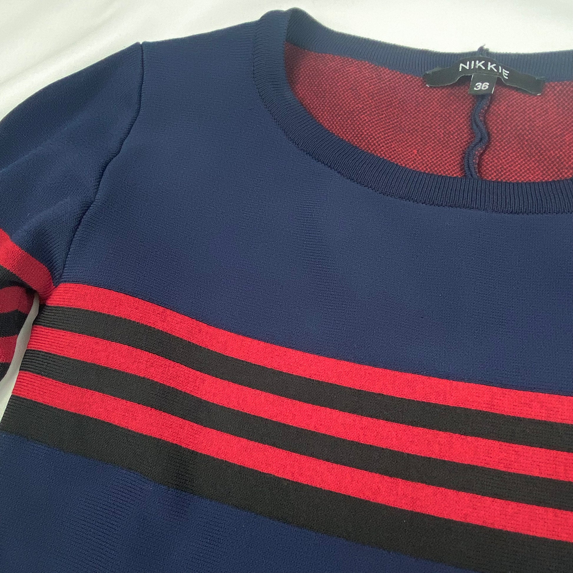 Chique jurk van Nikkie. Heeft een blauw en rood ontwerp met een dik, rekbaar materiaal. Ontworpen met lange mouwen en een A-lijn rok. Niet gevoerd voor een lichter gevoel.