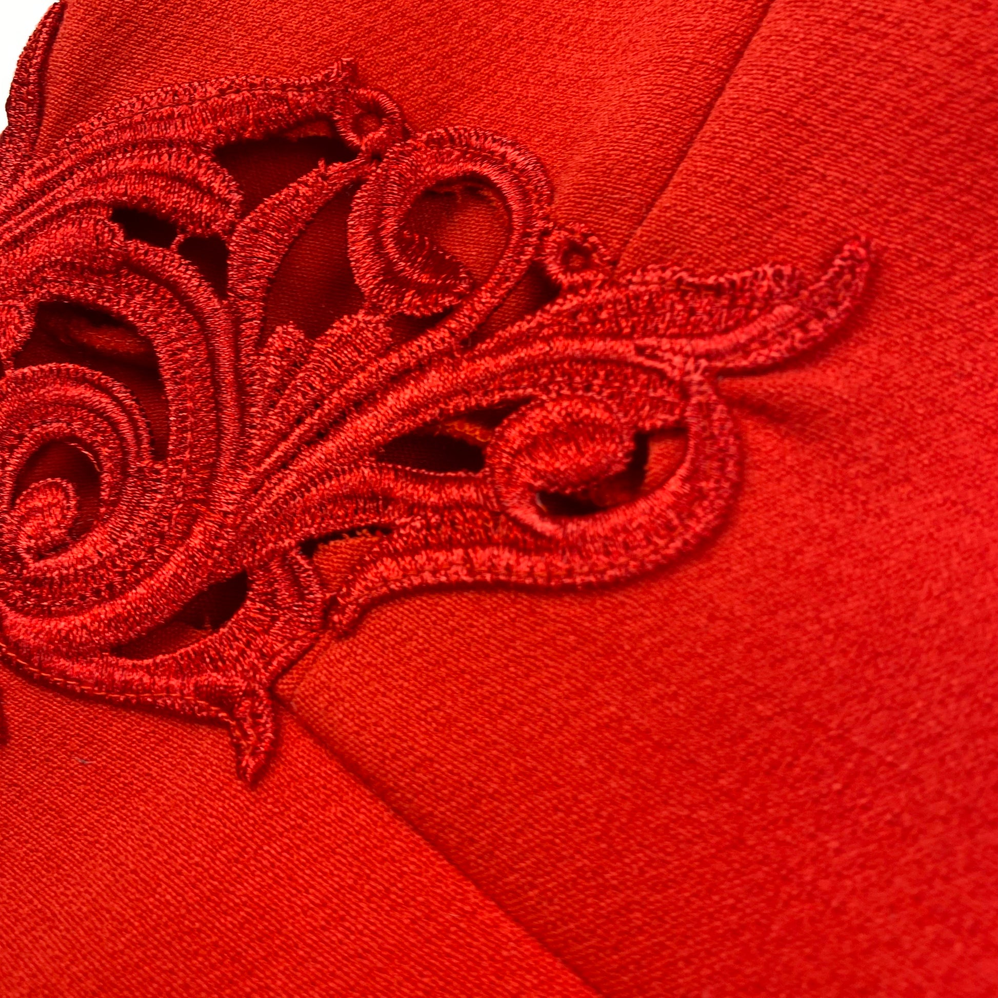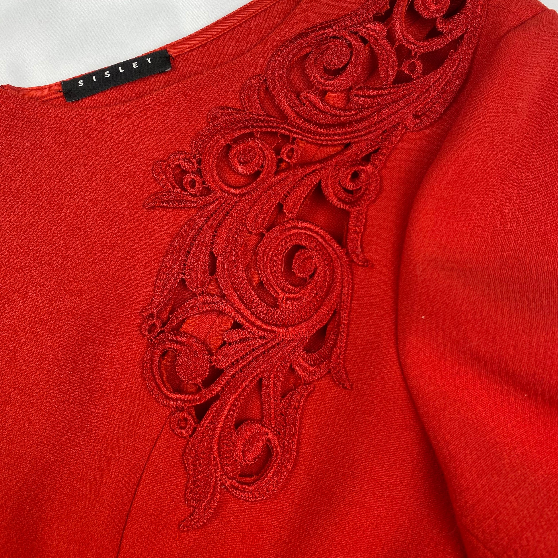 Stijlvolle rode jurk van Sisley. Voorzien van uitsnijdingen aan de voorkant, 3/4 mouwen en een lage halslijn aan zowel de voor- als achterkant.
