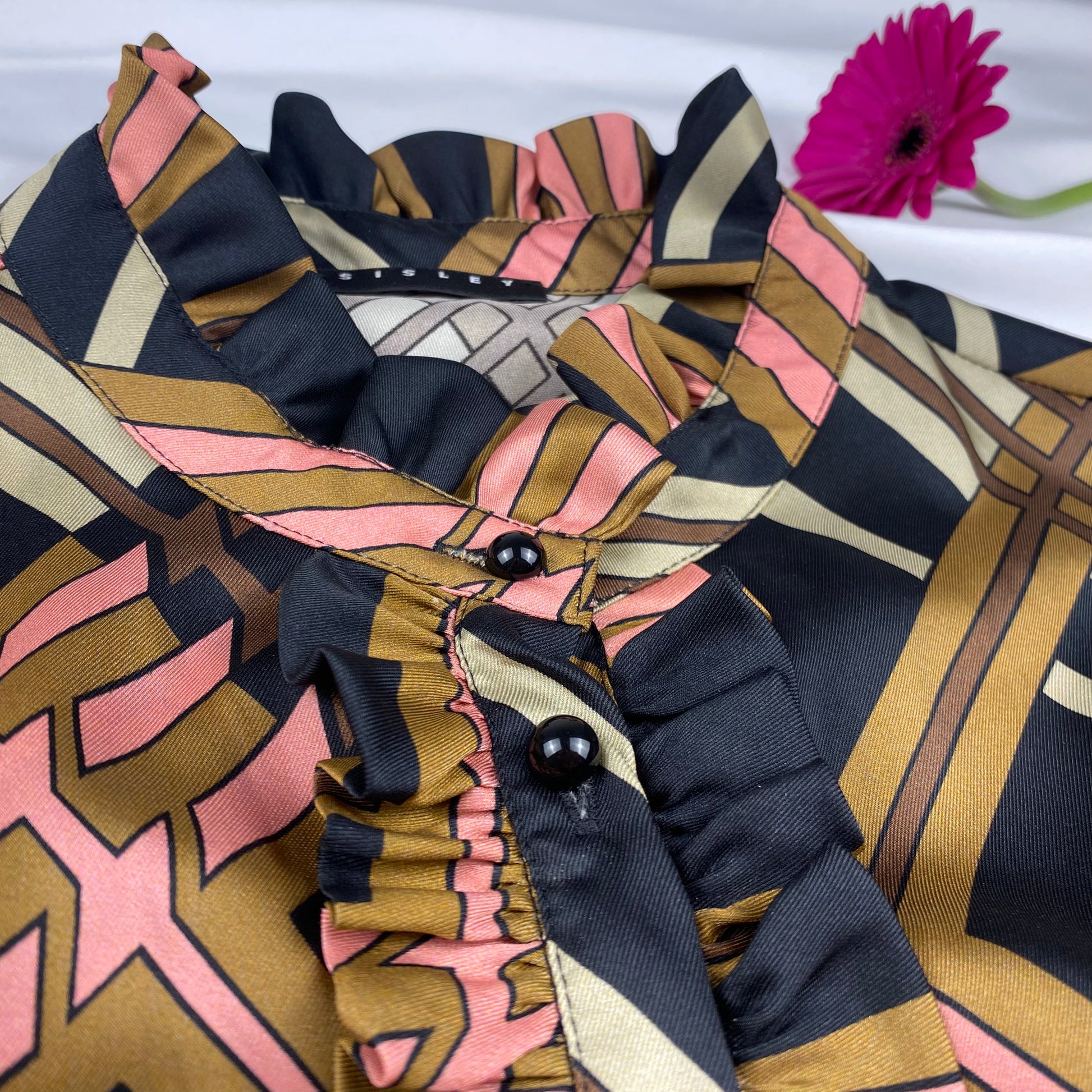 Elegante jurk met ruches van Sisley. Een prachtige mix van roze, bruin, zwart en crème met delicate ruches langs de halslijn, voorkant en mouwen. Met een geruit detail op de rok en functionele zakken aan de voorkant. Niet gevoerd.