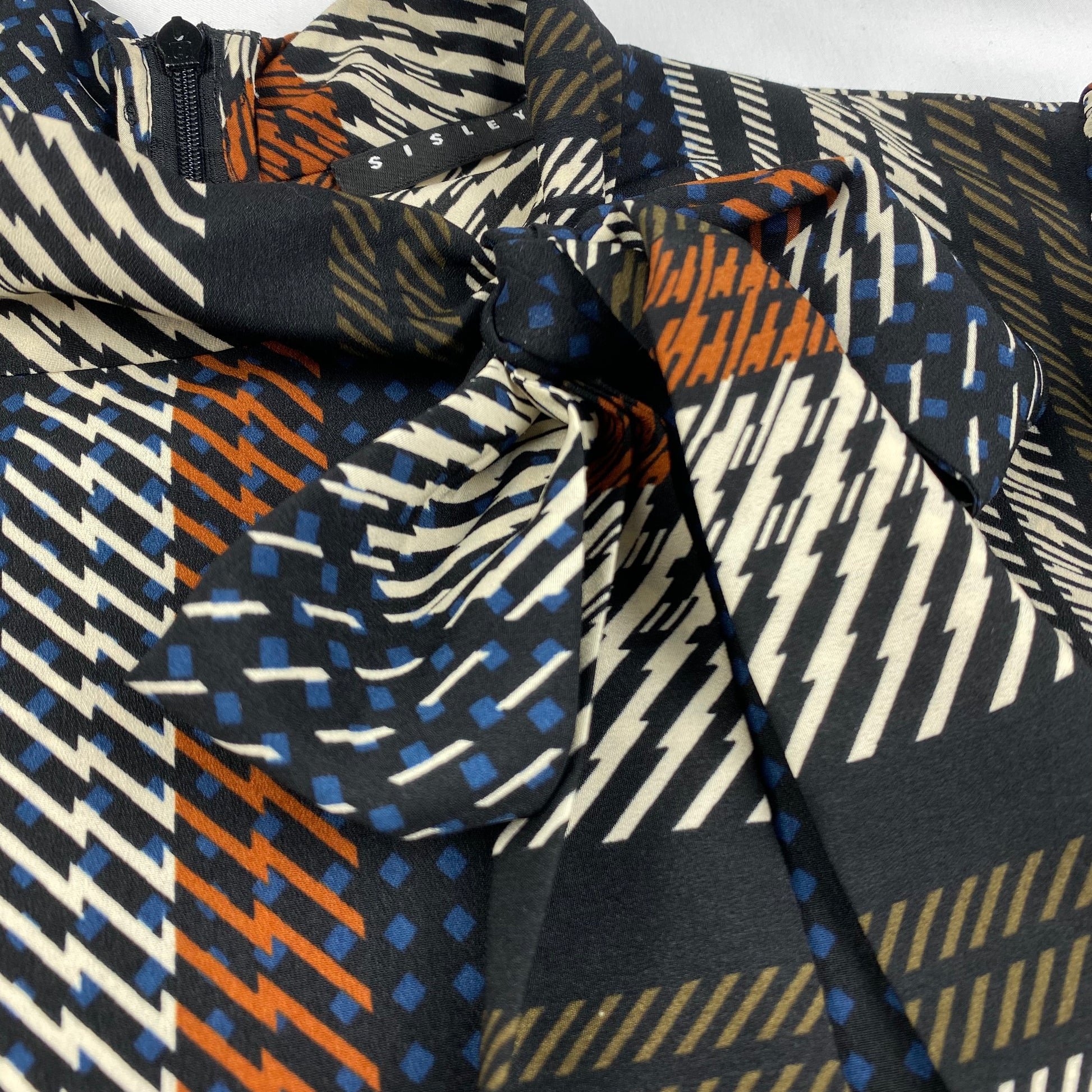 Charmante jurk van Sisley. Voorzien van een bruin, blauw, wit en zwart patroon met een strikje bij de halslijn en ruches aan de mouwen. Het soepelvallende ontwerp heeft 3/4 mouwen en een ritssluiting aan de achterkant. Deze jurk is gemaakt van kreukvrij materiaal en heeft geen voering.