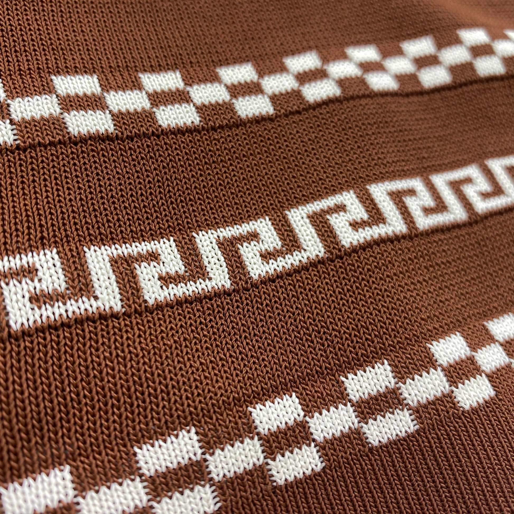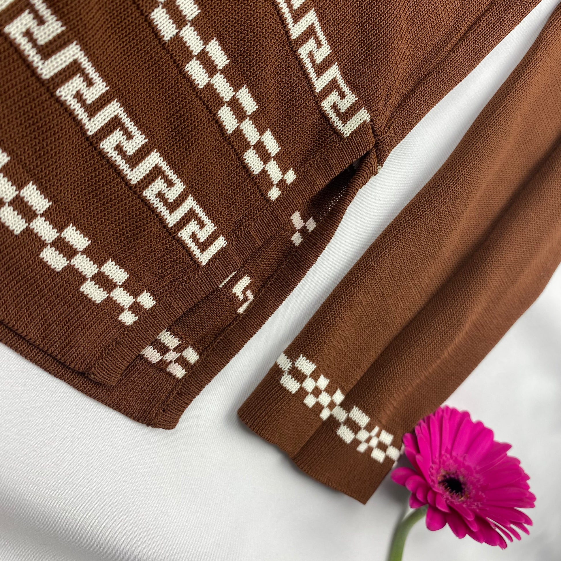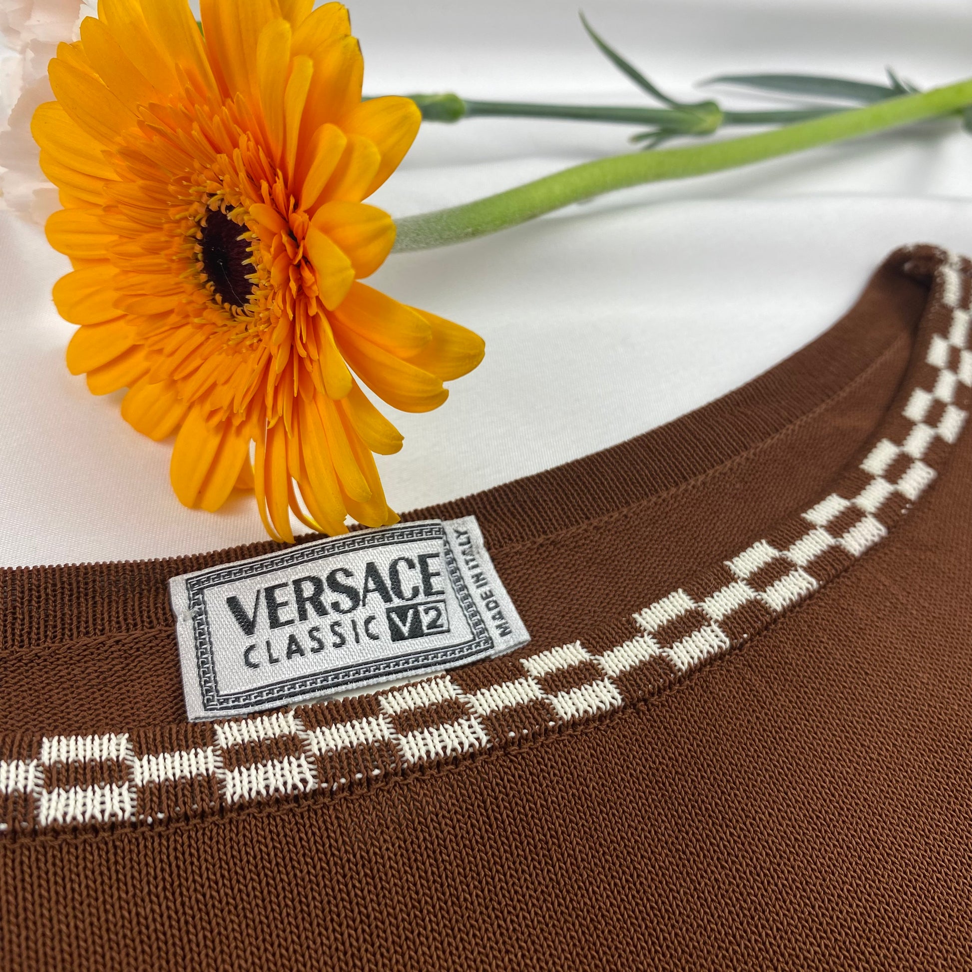 Bruin-crèmekleurige cropped trui van Versace. Met het kenmerkende Versace-patroon op de halslijn, onderkant en mouwen. Gemaakt van een zeer licht materiaal met kleine splitjes aan de zijkanten.