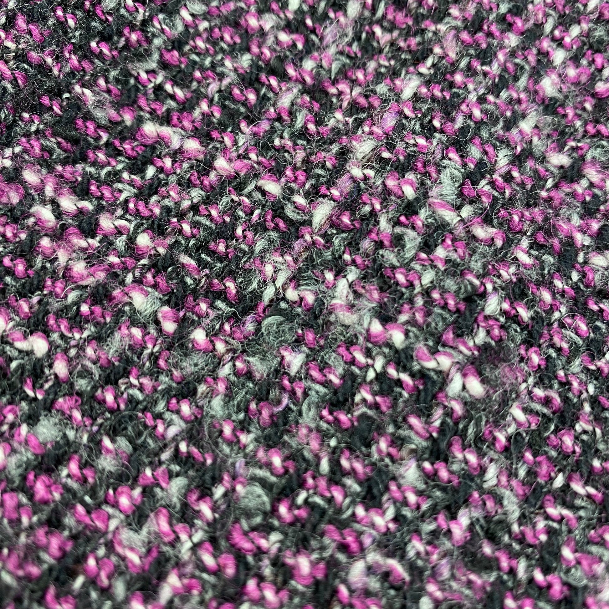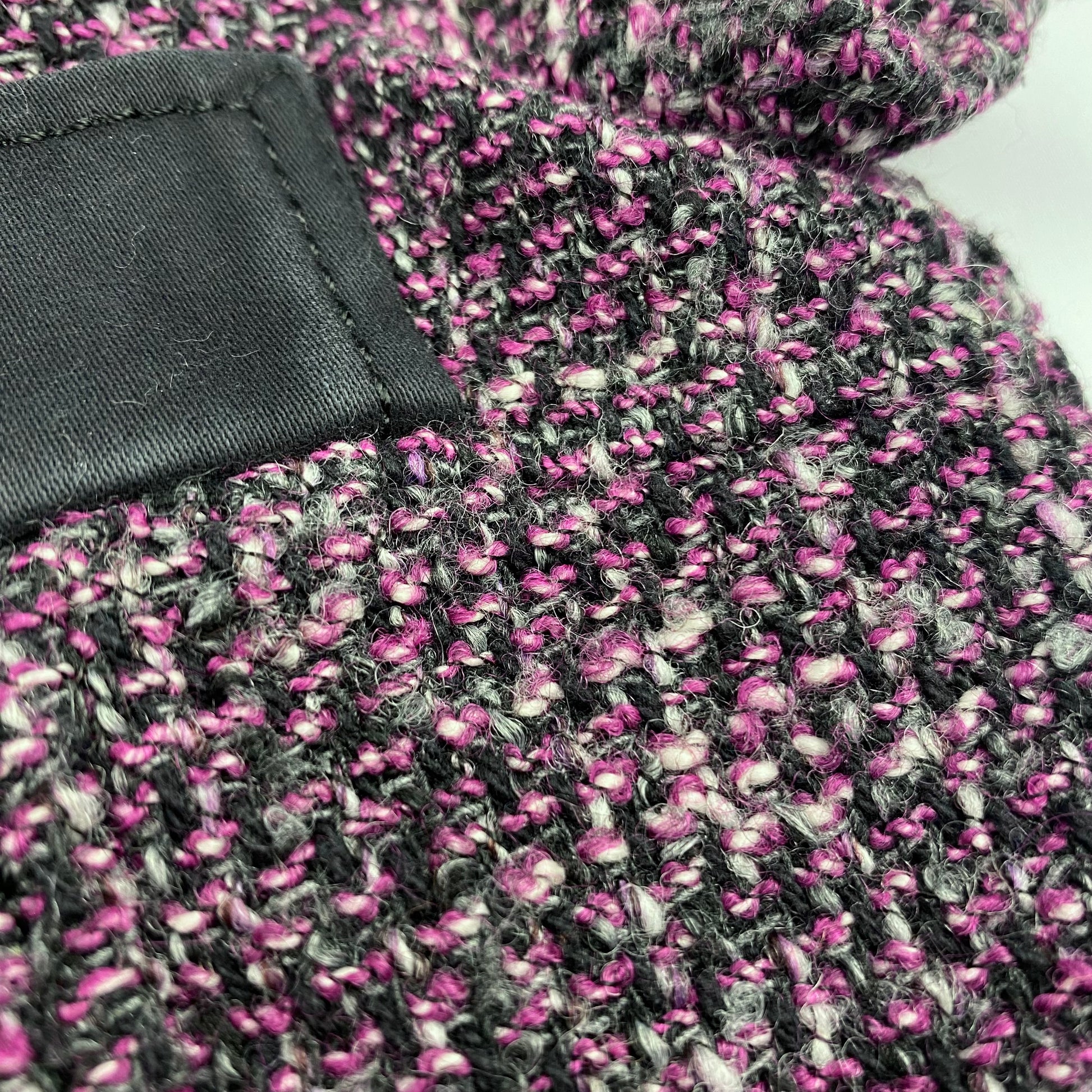 Chique jurk van Versace. Paars en wit tweed breisel met geruite details aan de onderkant (moet gerepareerd worden). Voorzien van vier zakken aan de voorkant, waarvan twee functioneel zijn. Ritssluiting aan de achterkant.